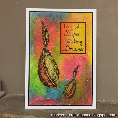 This one is made with distress inks. I die cut the circle using laying circle dies and just held it in place (with my hand) this I added colour to the background. I then stamped my feather and sentiment before covering the whole background with clear embossing powder. Before melting the powder i rubbed some of the powder off to leave areas with no powder and other areas with only a bit of powder. I then melted the powder to a rough texture over the card.